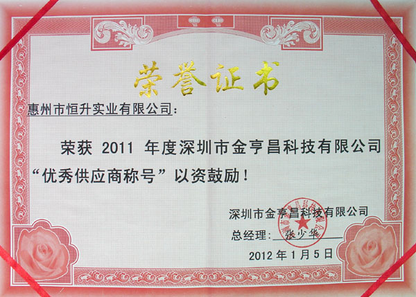 熱烈祝賀我司榮獲2011深圳金亨昌科技有限公司優(yōu)秀供應(yīng)商!